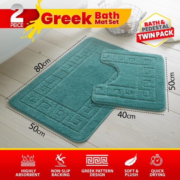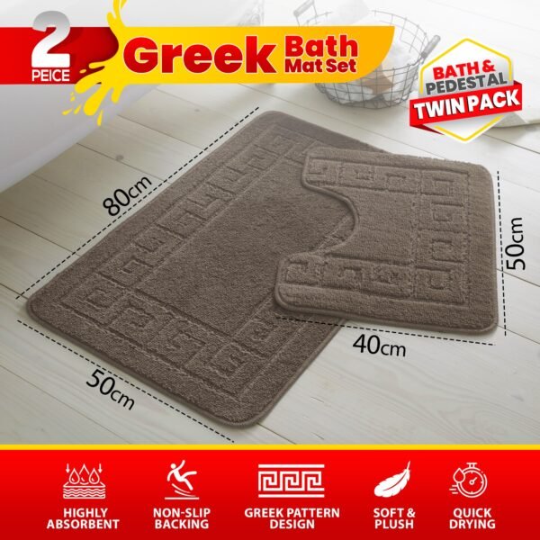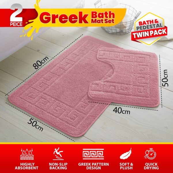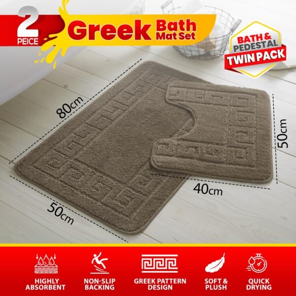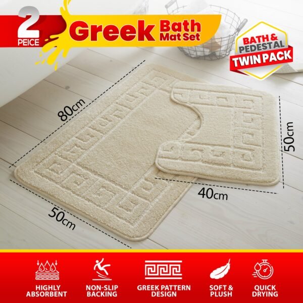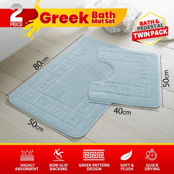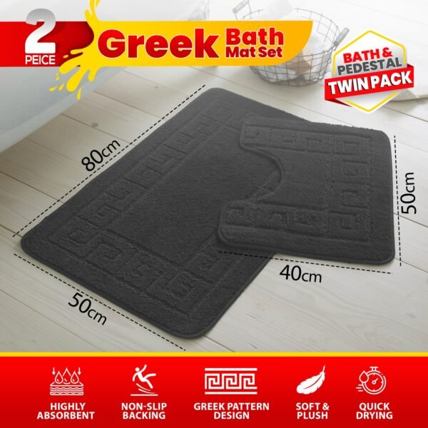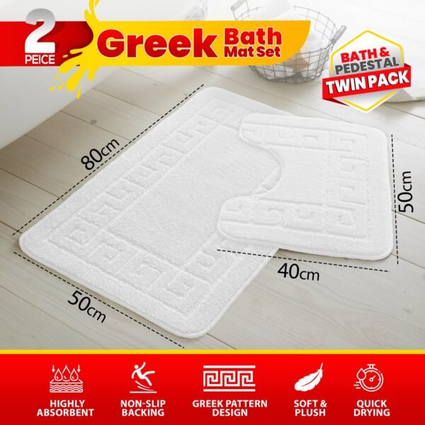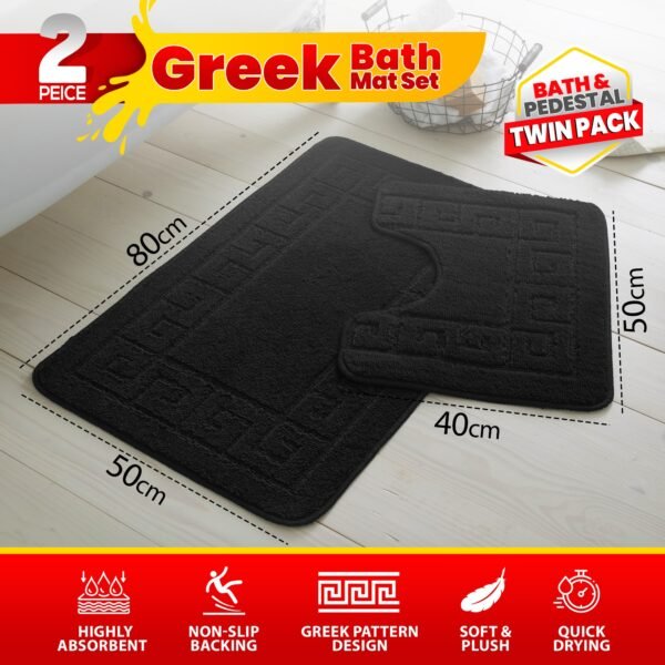 - What’s Included: 1 x Bath Mat + 1 x Pedestal Mat (matching Greek key pattern)