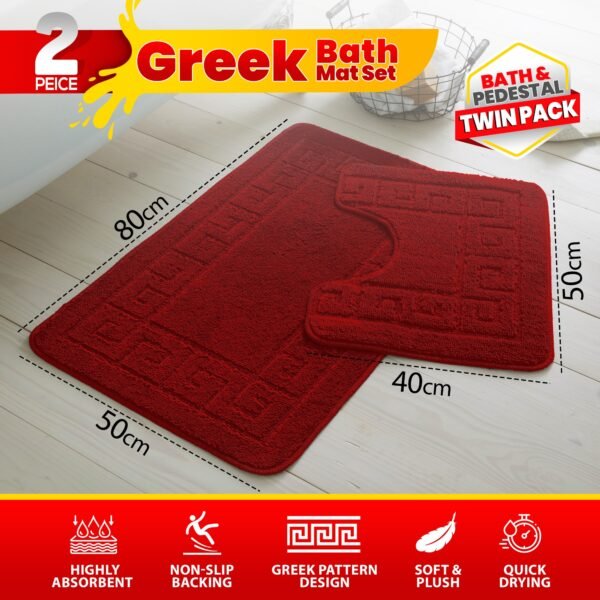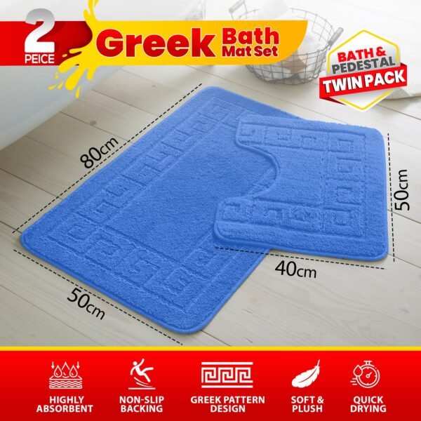The set includes one bath mat measuring 50x80cm (20″x31″), designed to sit in front of a bathtub or shower enclosure, and one pedestal mat measuring 50x40cm (20″x16″), designed to fit neatly around the base of a toilet, pedestal basin, or WC area. Both pieces feature the same matching Greek key pattern and rubber non-slip backing, creating a fully coordinated 2-piece bathroom set. No additional mats or accessories are included.